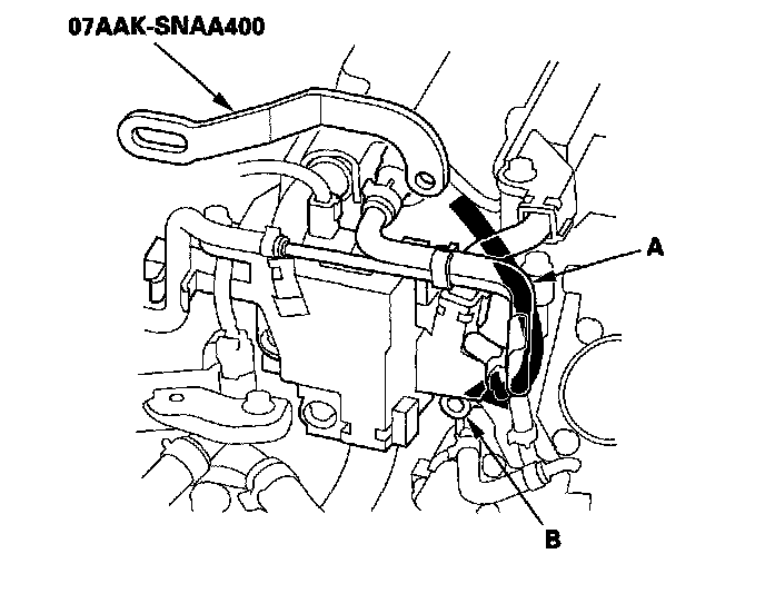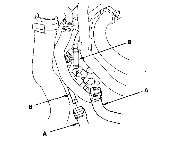 19. Disconnect the ATF warmer hoses (A) from the ATF lines (B). Turn the end of the ATF warmer hoses up to prevent ATF from flowing out, then plug the hoses and lines.