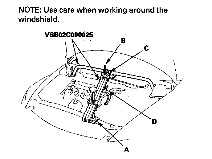 22. Remove the harness clamp (A) from its bracket (B), and remove the radiator hose (C) from the clamp (D).