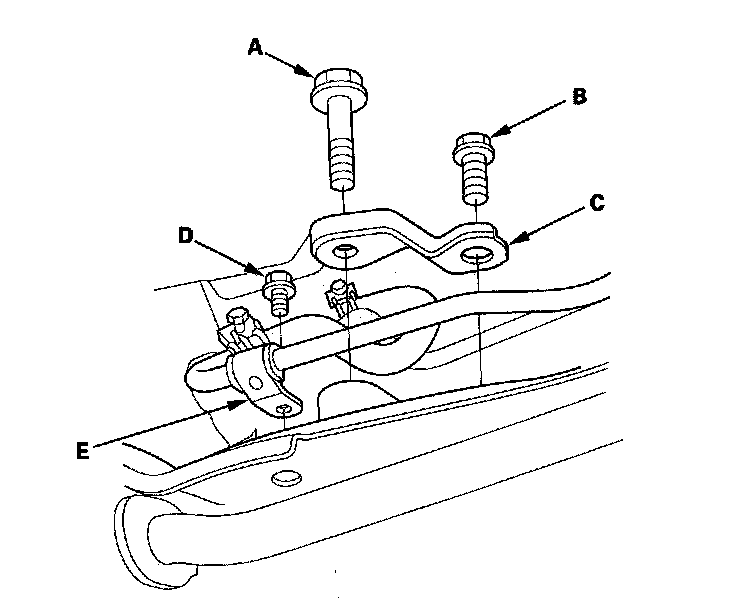 31. Remove the bolt (D) securing the power steering fluid line clamp bracket (E).