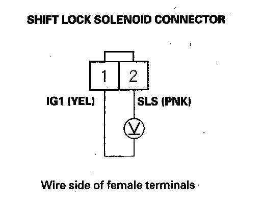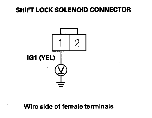 10. Release the brake pedal, and measure the voltage between shift lock solenoid connector terminals No. 1 and No. 2. The shift lever must be in P.