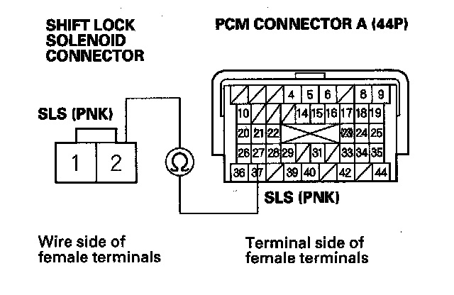 14. Check for continuity between PCM connector terminal A27 and shift lock solenoid connector terminal No. 2.
