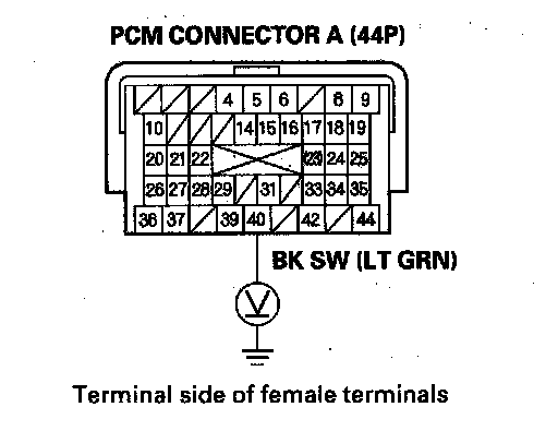 19. Measure the voltage between PCM connector terminal A40 and body ground while pressing the brake pedal and when the brake pedal is released.