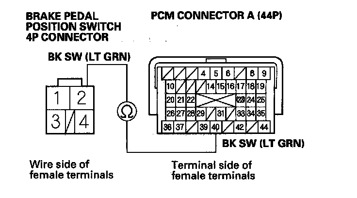 20. Check for continuity between PCM connector terminal A40 and brake pedal position switch 4P connector terminal No. 2.