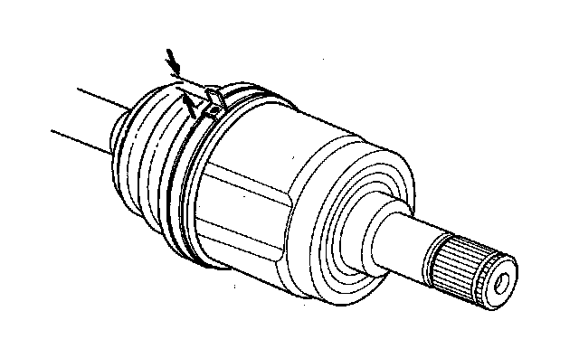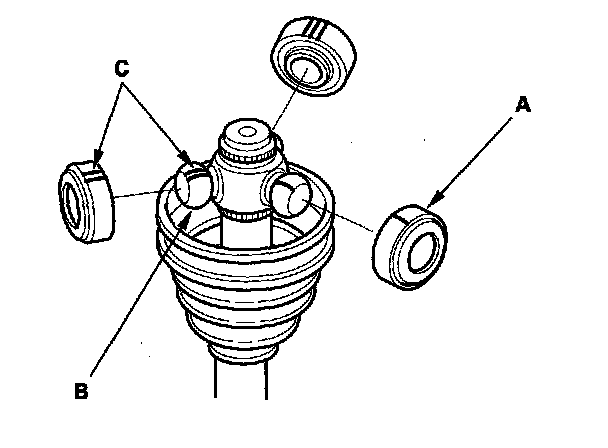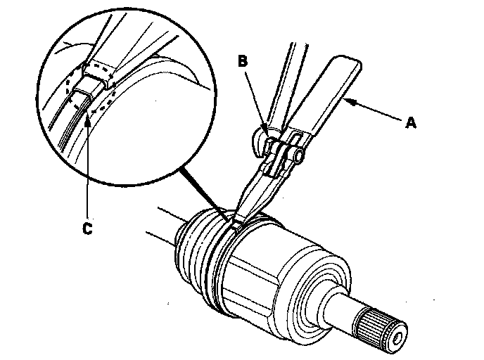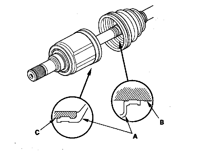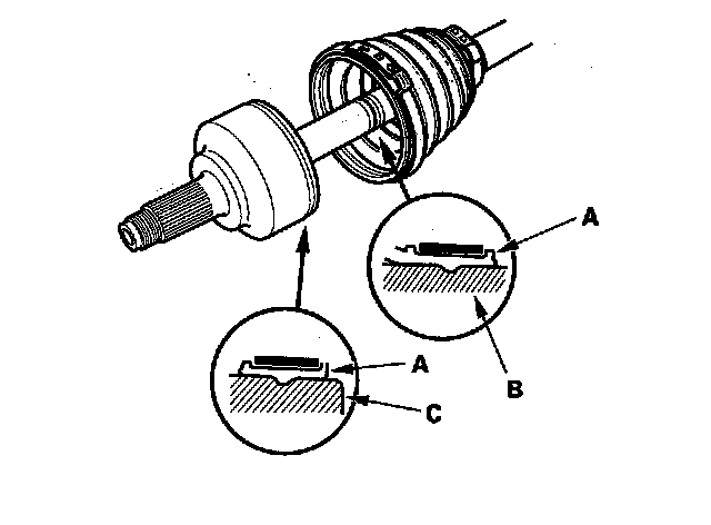 8. Fit the boot ends (A) onto the driveshaft (B) and the inboard joint (C).