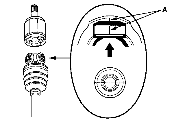 ^ Reinstall the inboard joint onto the driveshaft by aligning the marks (A) you made on the inboard joint and the rollers.