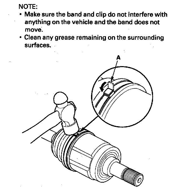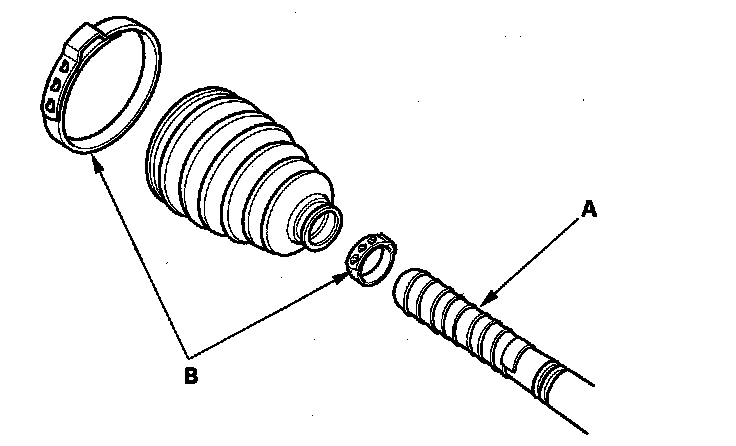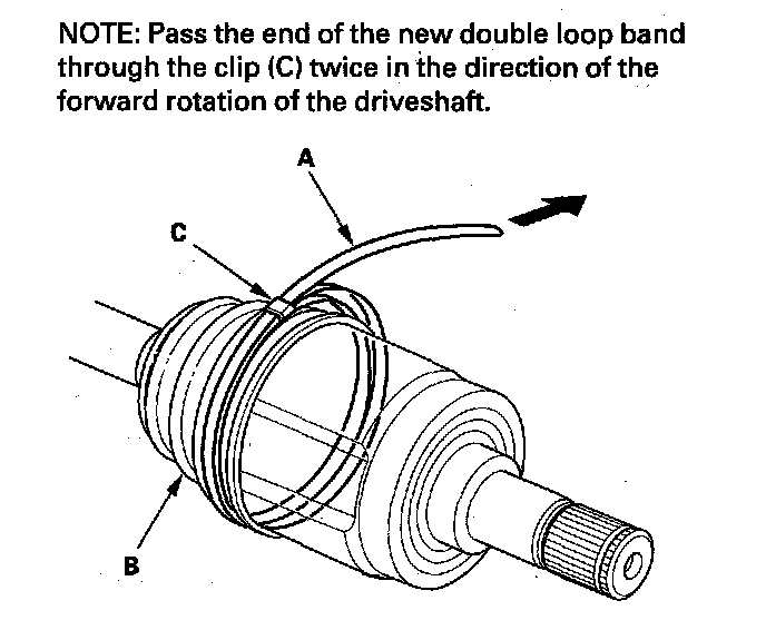 11. Fit the boot ends onto the driveshaft and the inboard joint, then install the new double loop band (A) onto the boot (B).