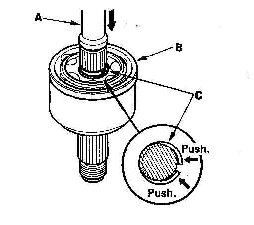 5. Insert the driveshaft (A) into the outboard joint (B) until the stop ring (C) is closed.