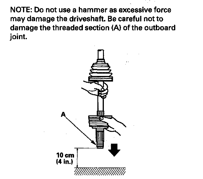 6. To completely seat the outboard joint, pick up the driveshaft and joint, and tap or hit them from a height of about 10 cm (4 in.) onto a hard surface.