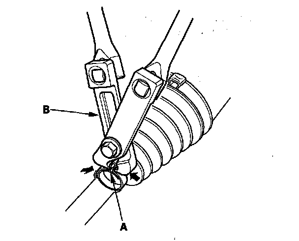 11. Close the ear portion (A) of the band with a commercially available boot band pliers Kent-Moore J-35910 or equivalent (B).