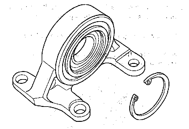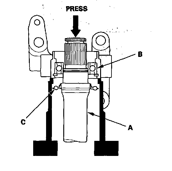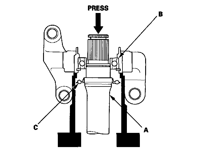 2. Press the intermediate shaft (A) out of the intermediate shaft bearing (B) using a press. Be careful not to damage the bearing support ring (C) on the intermediate shaft during disassembly.