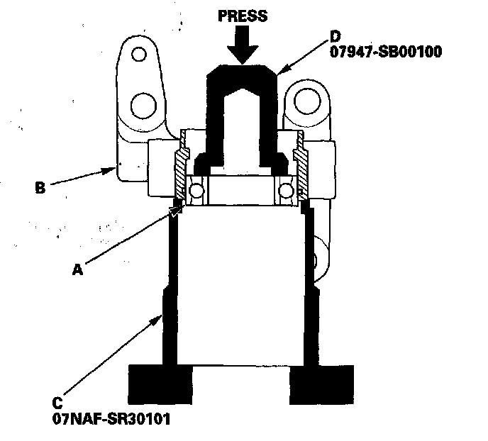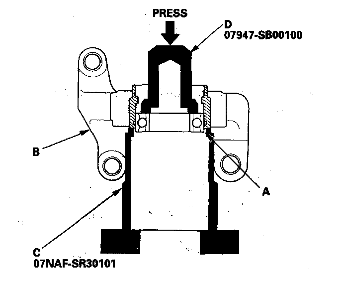 4. Press the intermediate shaft bearing (A) out of the bearing support (B) using the half shaft base (C), oil seal driver (D), and a press.