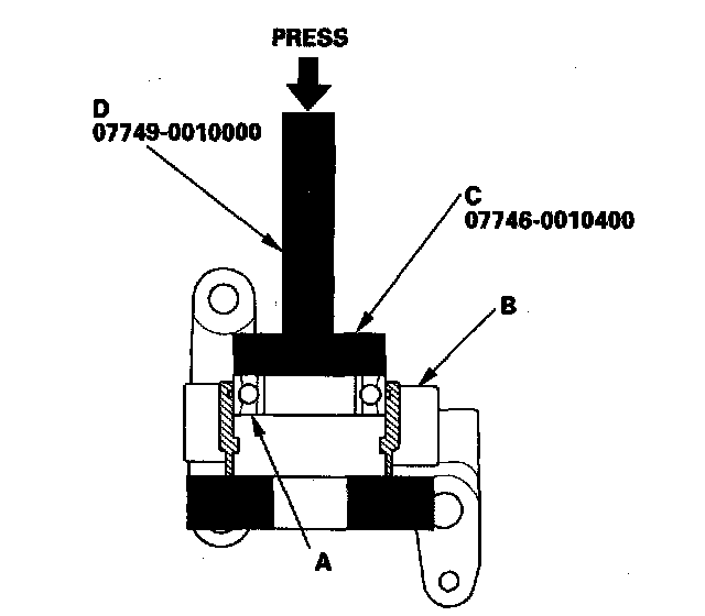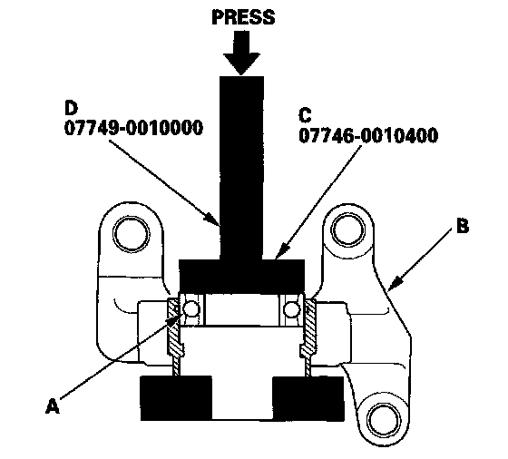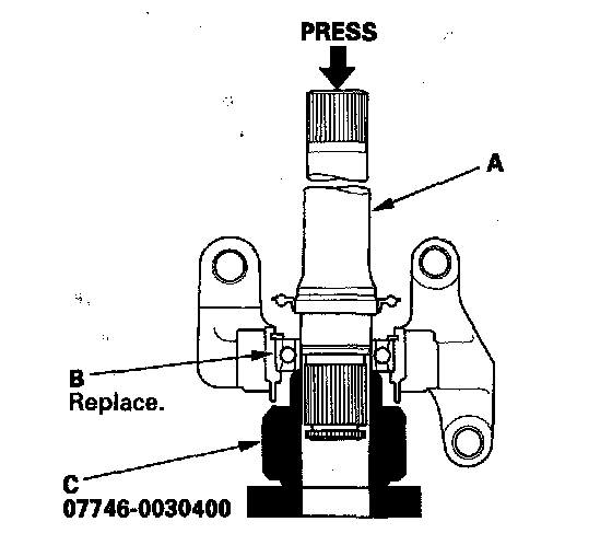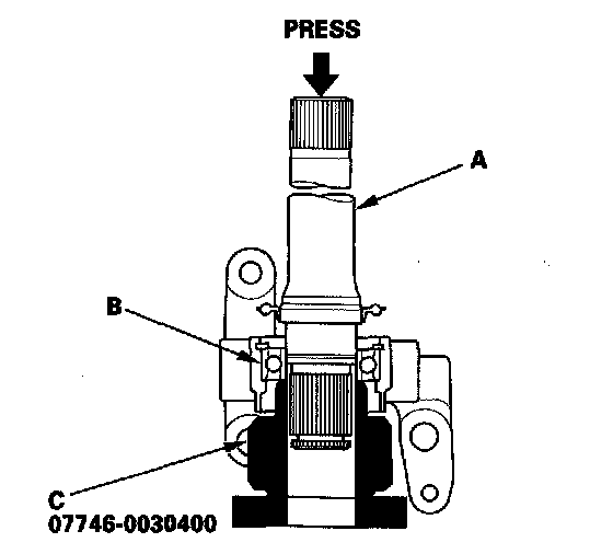 4. Press the intermediate shaft (A) into the new shaft bearing (B) using the 35 mm I.D. attachment (C) and a press.