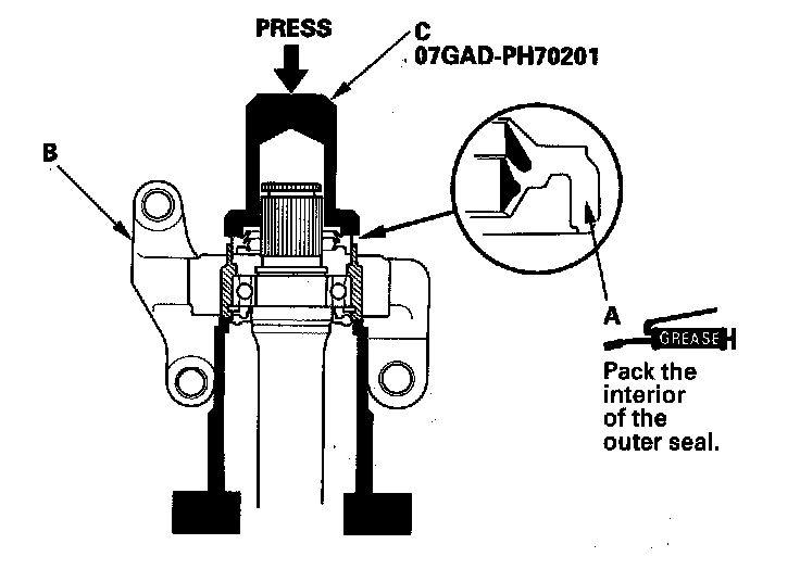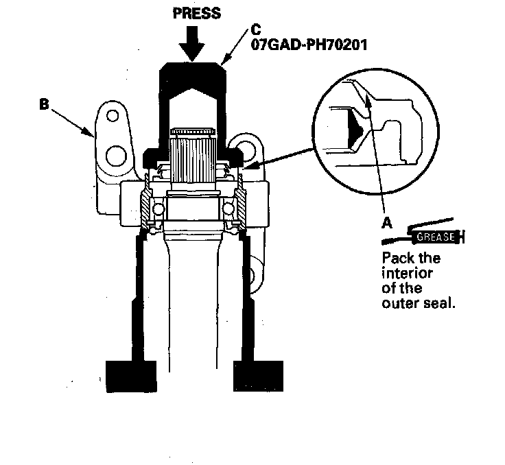 6. Install the new outer seal (A) into the bearing support (B) using the oil seal driver (C) and a press.