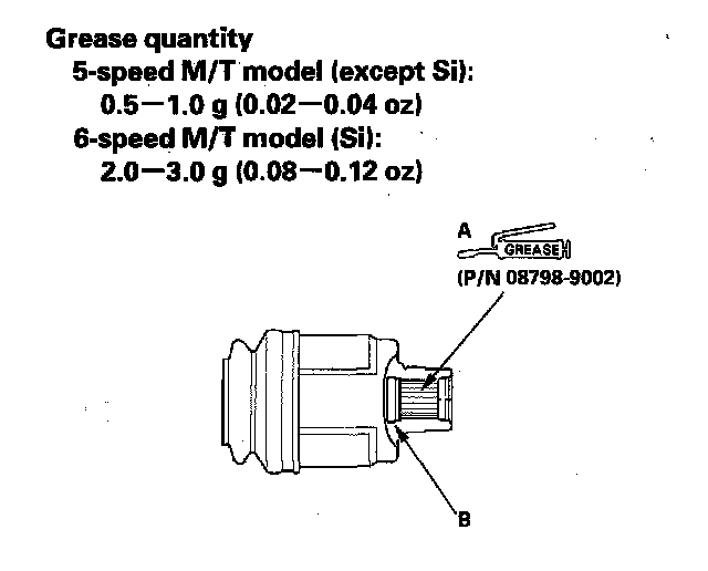 3. M/T model: Apply specified super high temp urea grease (P/N 08798-9002) to the whole splined surface (A) of the right driveshaft. After applying grease, remove the grease from the splined grooves at intervals of 2 - 3 splines and from the set ring groove (B) so that air can bleed from the intermediate shaft.