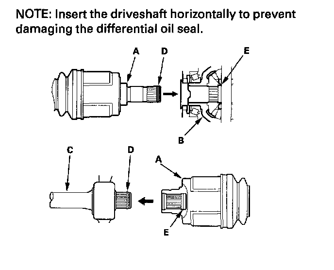 5. Insert the inboard end (A) of the driveshaft into the differential (B) or intermediate shaft (C) (M/T model) until the set ring (D) locks in the groove (E).