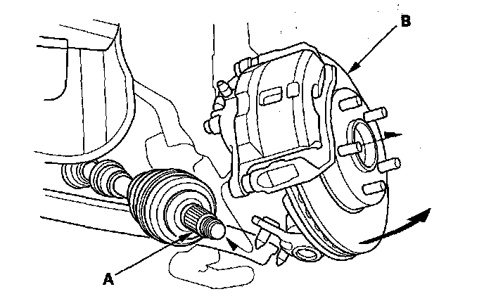 6. Install the outboard joint (A) into the front wheel hub (B).