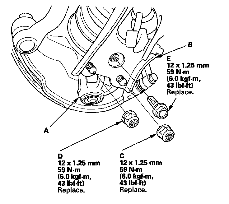 7. Install the knuckle (A) onto the lower arm (B). During installation, install a new flange bolt and new self-locking nuts. After lightly tightening all three fasteners, tighten them to the specified torque in the following order; the nut on the front (C), the nut on the nut on the rear (D), then the bolt (E).