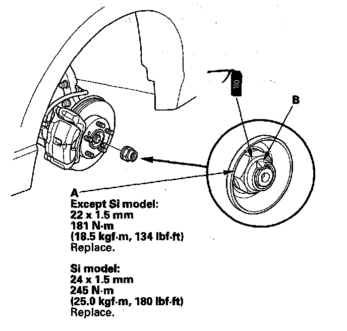 9. Install a new spindle nut, then tighten the nut. After tightening, use a drift to stake the spindle nut shoulder (B) against the driveshaft.