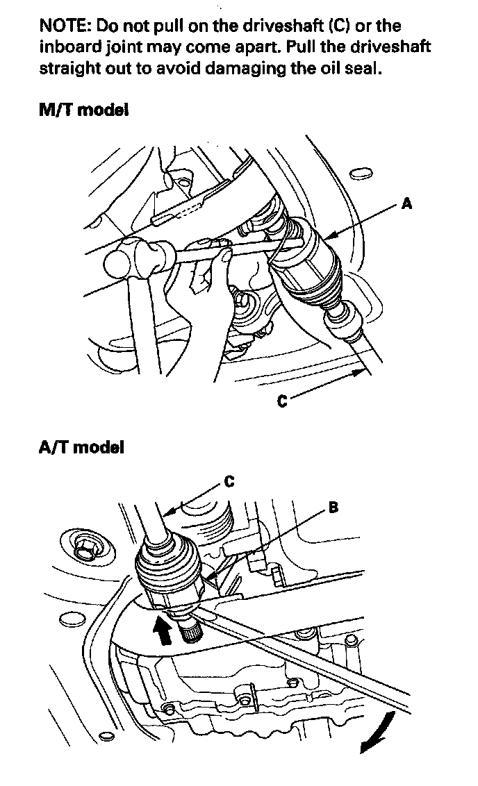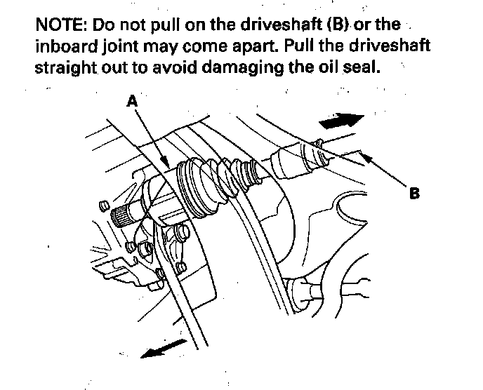 8. Right driveshaft: Drive the inboard joint (A) off of the intermediate shaft using a drift and hammer (M/T model). Pry the inboard joint (B) from the differential with a prybar (A/T model). Remove the driveshaft as an assembly.