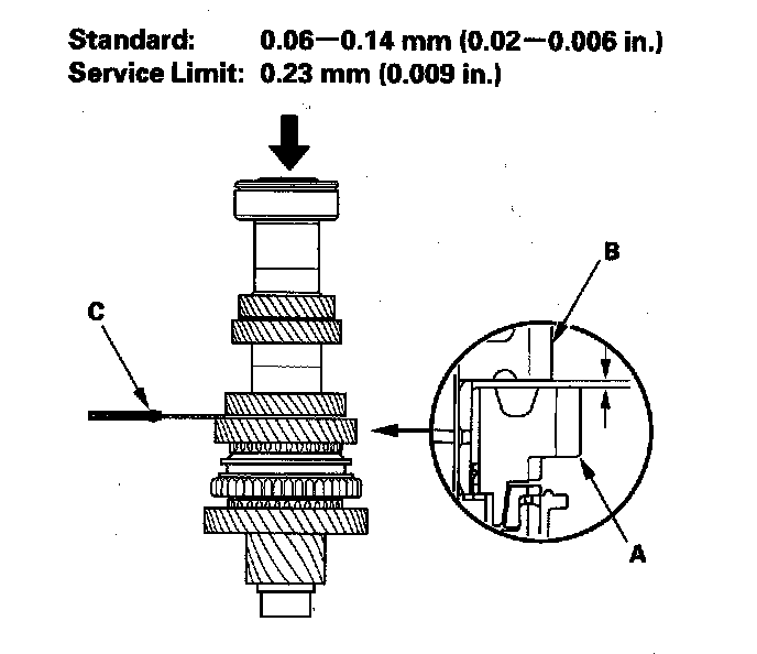 4. Measure the clearance between 2nd gear (A) and 3rd gear (B) with a feeler gauge (C). If the clearance is more than the service limit, go to step 5.