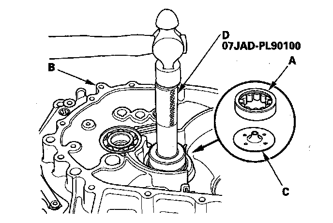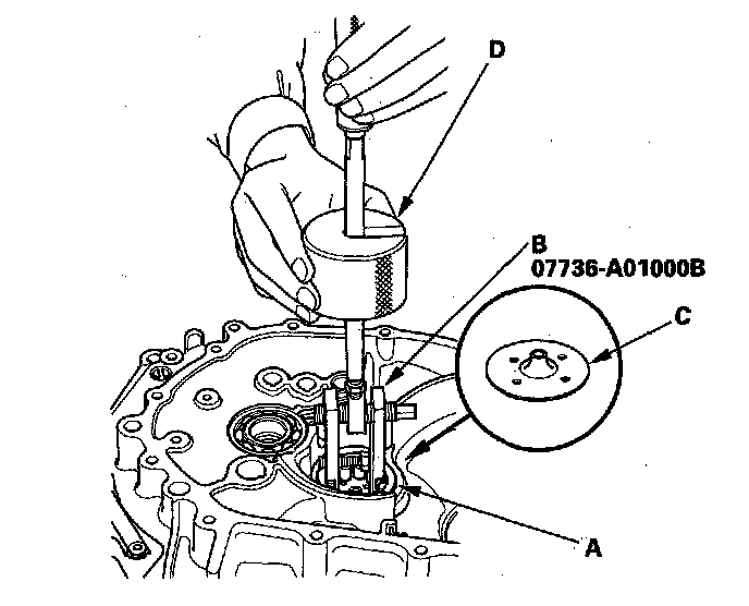 1. Remove the needle bearing (A) using the 20 - 40 mm adjustable bearing puller (B) and a commercially available 3/8" - 16 UNF slide hammer (D), then remove oil guide plate C.