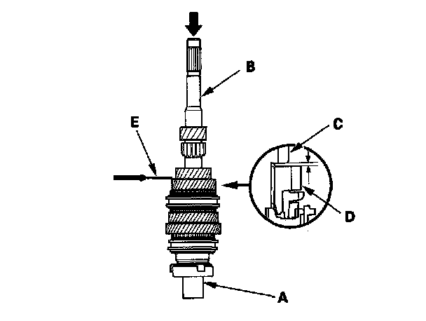 2. Measure the clearance between 2nd gear (C) and 3rd gear (D) with a feeler gauge (E).