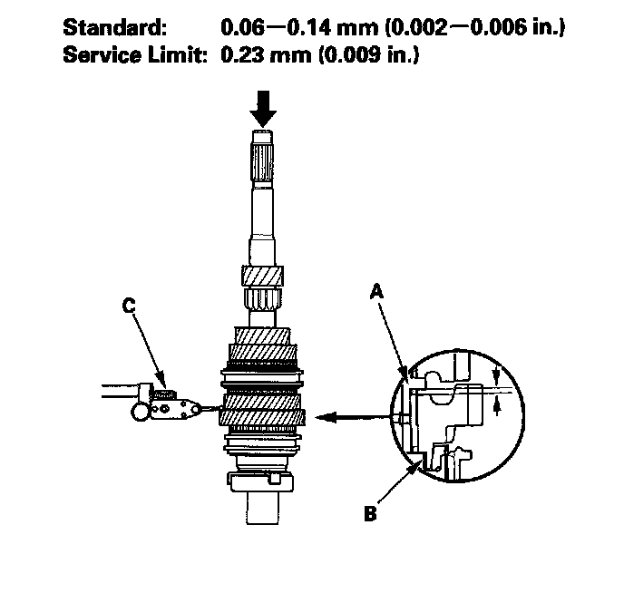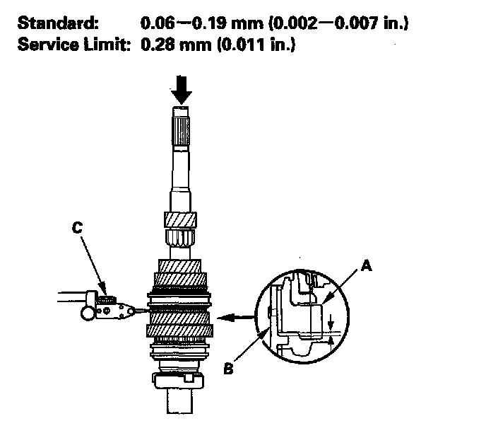 4. Measure the clearance between 4th gear (A) and the distance collar (B) with a dial indicator (C).