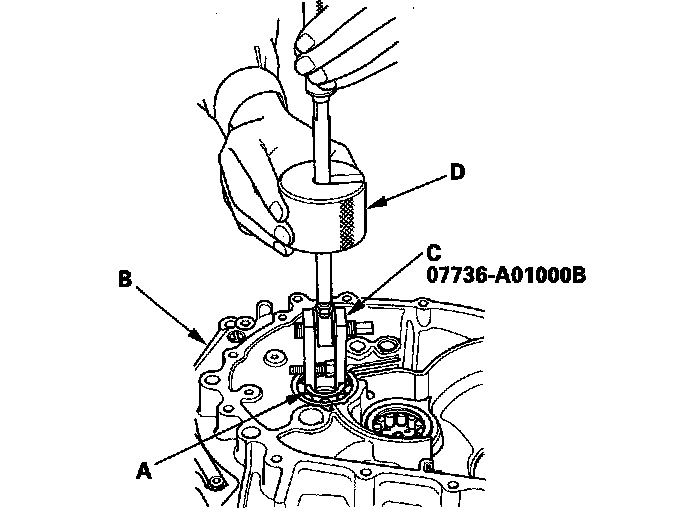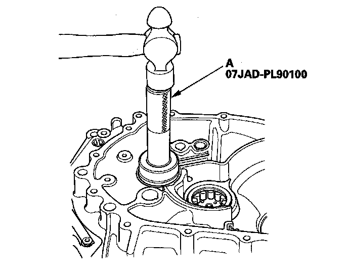 4. Drive in the new ball bearing from the transmission side using the oil seal driver (A).