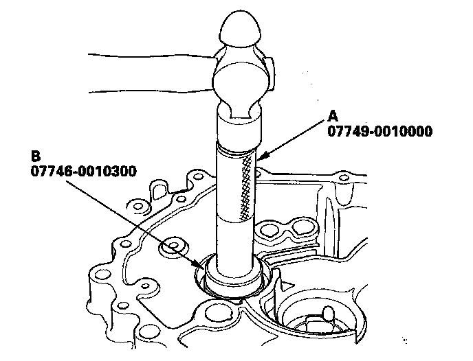 3. Drive in the new oil seal from the transmission side using the drive (A) and 42 x 47 mm attachment (B).