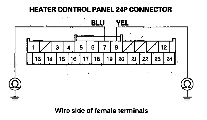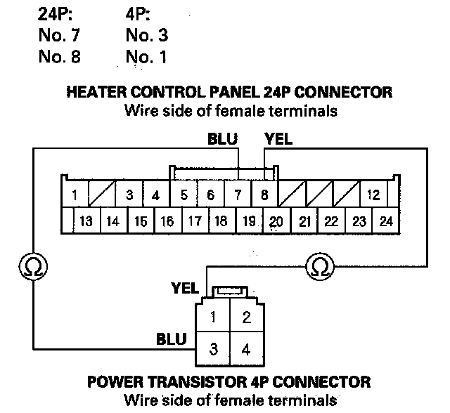 19. Check for continuity between the following terminals of the heater control panel 24P connector and the power transistor 4P connector.