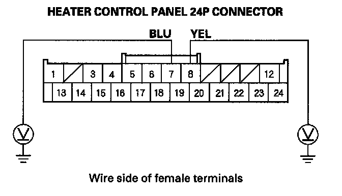 21. Measure the voltage between body ground and the heater control panel 24P connector No. 7 and No. 8 terminals individually.