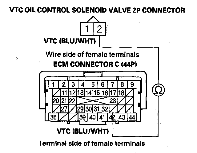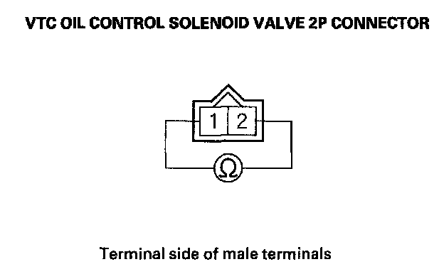 8. At the solenoid valve side, measure resistance between VTC oil control solenoid valve 2P connector terminals No. 1 and No. 2.