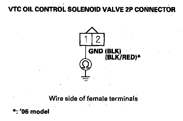 9. Check for continuity between VTC oil control solenoid valve 2P connector terminal No. 1 and body ground.