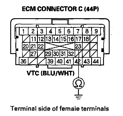 13. Check for continuity between VTC oil control solenoid valve 2P connector terminal No. 2 and ECM connector terminal C23.