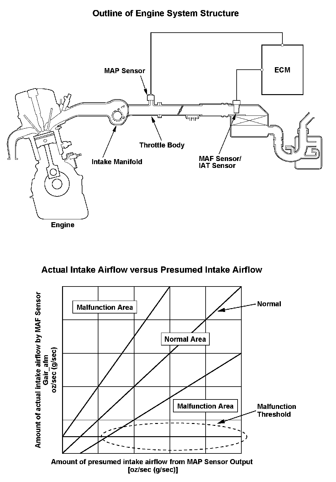 The ECM compares the MAF sensor output (amount of intake airflow) and the amount of intake airflow calculated from MAP sensor output. If their difference is too large (in the malfunction area), the ECM detects a malfunction and a DTC is stored.