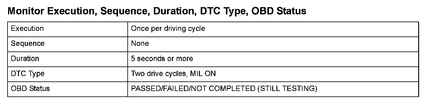 Monitor Execution, Sequence, Duration, DTC Type, OBD Status