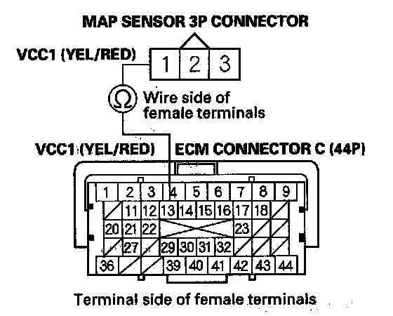 11. Check for continuity between ECM connector' terminal CT3 and MAP sensor 3P connector terminal No. 1.