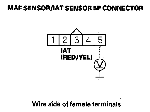 11. Measure voltage between MAF sensor/IAT sensor 5P connector terminal No. 5 and body ground.