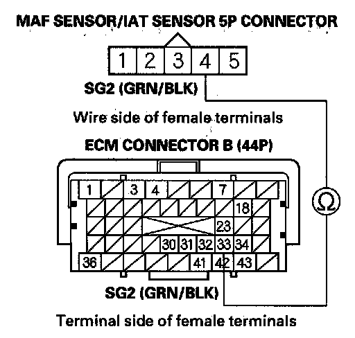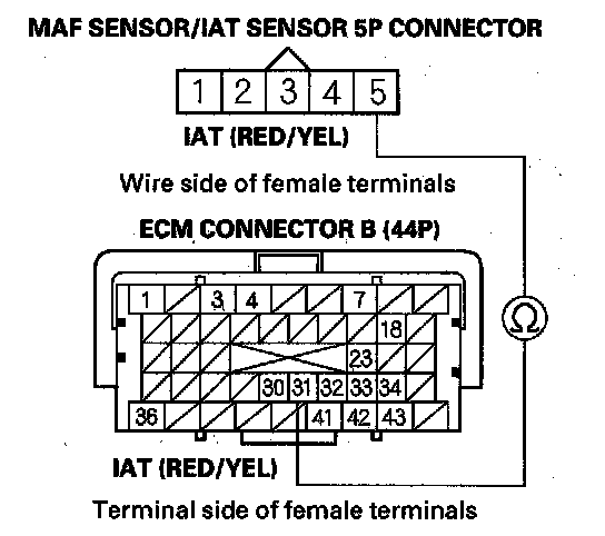 19. Check for continuity between MAF sensor/IAT sensor 5P connector terminal No. 5 and ECM connector terminal B31.