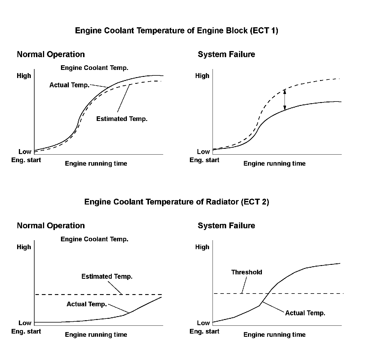 If the difference between the current measured coolant temperature at the radiator (ECT 2) and the initial coolant temperature at the radiator (ECT 2) is at least 41 °F (5 °C)*2, 46 °F (8 °C)*3 when the calculated coolant temperature at the engine (ECT 1) reaches 164 °F (74 °C), a malfunction is detected (thermostat stuck open); or if the coolant temperature at the radiator (ECT 2) only reaches 72 °F (22 °C), a malfunction is detected (thermostat malfunction).