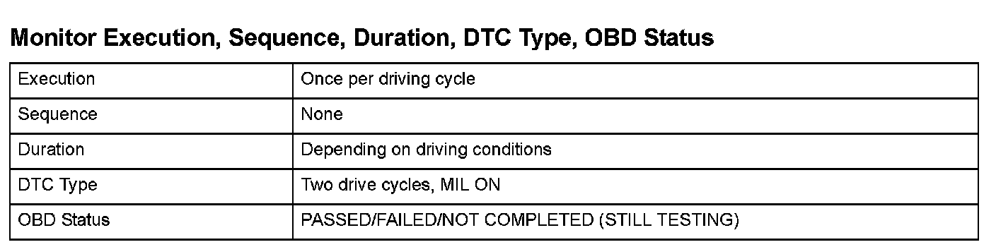 Monitor Execution, Sequence, Duration, DTC Type, OBD Status
