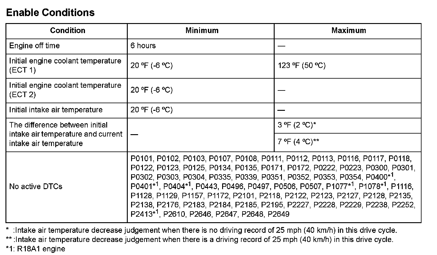 When a malfunction is detected during the first drive cycle with the ECT and IAT at engine start up within the specified temperature range, a Temporary DTC is stored in the ECM/PCM memory. If the malfunction recurs during the next (second) drive cycle with the ECT and IAT at engine start-up within the specified temperature range, the MIL comes on and the DTC and the freeze frame data are stored.