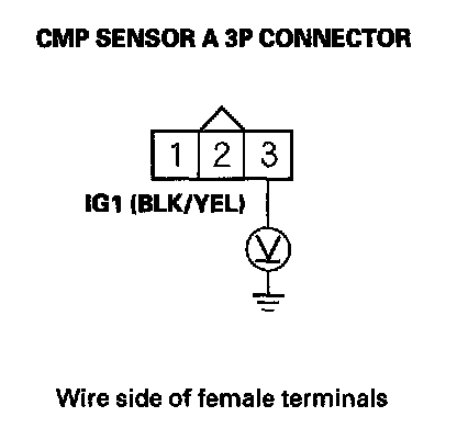 9. Measure voltage between CMP sensor A 3P connector terminal No. 1 and body ground.