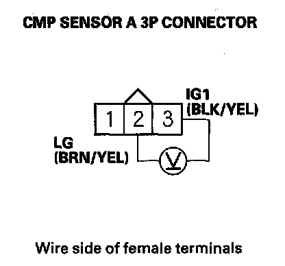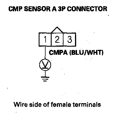 10. Measure voltage between CMP sensor A 3P connector terminals No. 2 and No. 3.