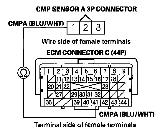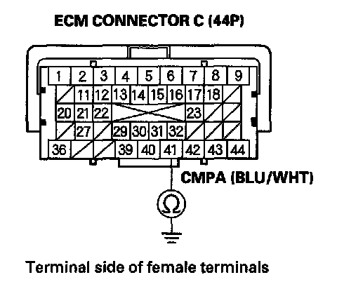 15. Check for continuity between CMP sensor A 3P connector terminal No. 1 and ECM connector terminal C41.