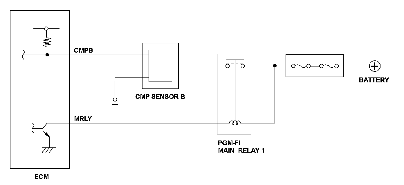 Camshaft position (CMP) sensor B consists of a rotor and a semiconductor that detects rotor position. When the rotor turns after starting the engine, the changes of magnetic flux in the semiconductor are converted into pulsing signals to the engine control module (ECM). CMP sensor B detects the top dead center of each cylinder for fuel injection timing. If no CMP sensor B pulsing signals are detected, a malfunction is detected and a DTC is stored.