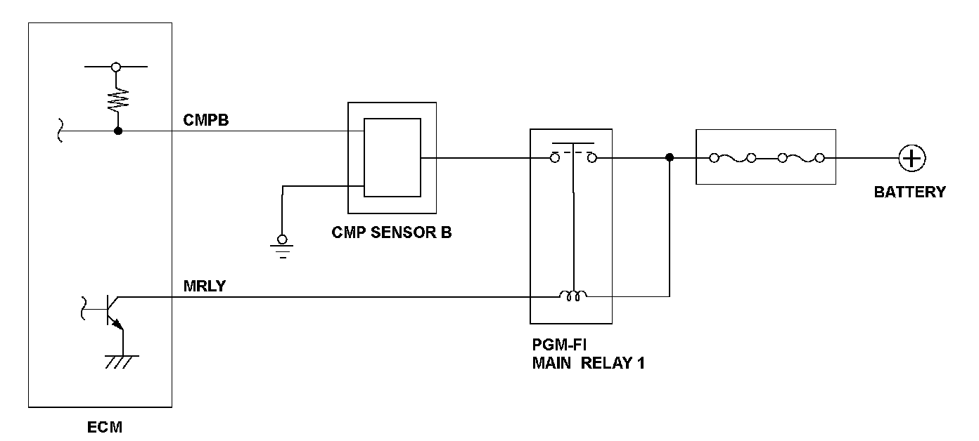 Camshaft position (CMP) sensor B consists of a rotor and a semiconductor that detects rotor position. When the rotor turns after starting the engine, the changes of magnetic flux in the semiconductor are converted into pulsing signals to the engine control module (ECM). CMP sensor B detects the top dead center of each cylinder for fuel injection timing.
