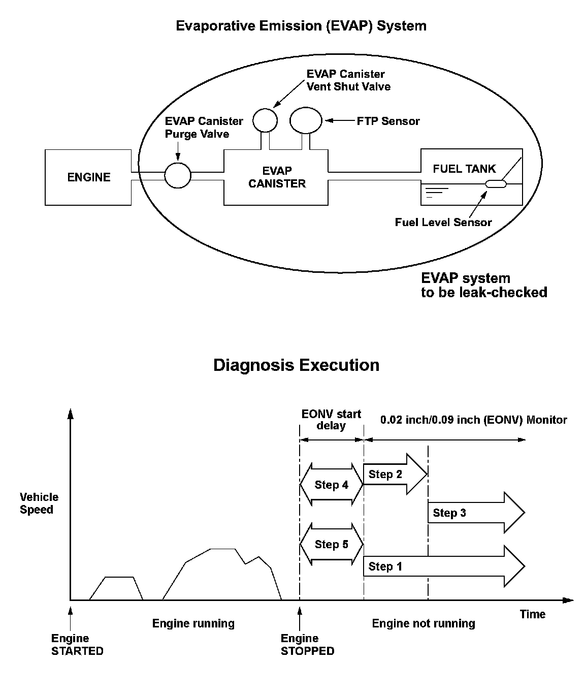 The evaporative emission (EVAP) leak detection system uses an engine off natural vacuum (EONV) method. The EONV method detects leakage from the change in fuel tank pressure via the fuel tank pressure (FTP) sensor with the engine off.
