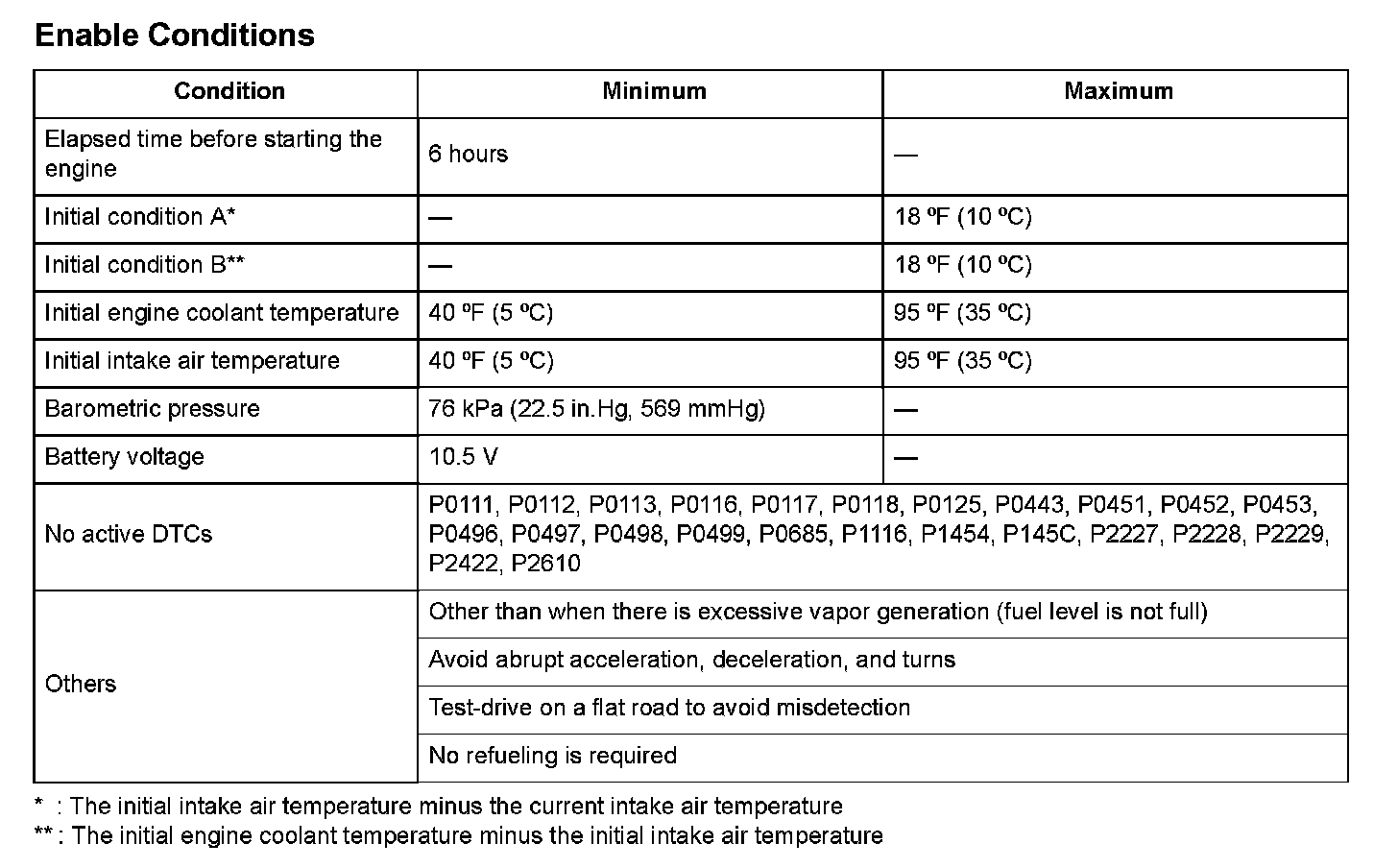 1. After the vehicle has been left for an appropriate amount of time as specified, with the engine coolant temperature and intake air temperature within the specified range, start the engine.