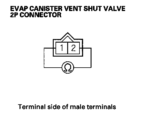 11. At the valve side, measure resistance between EVAP canister vent shut valve 2P connector terminals No. 1 and No. 2.
